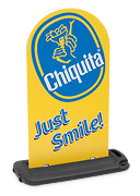 Dubbelsidig display för posters. Med unik höjdjustering och kompakt transportformat.